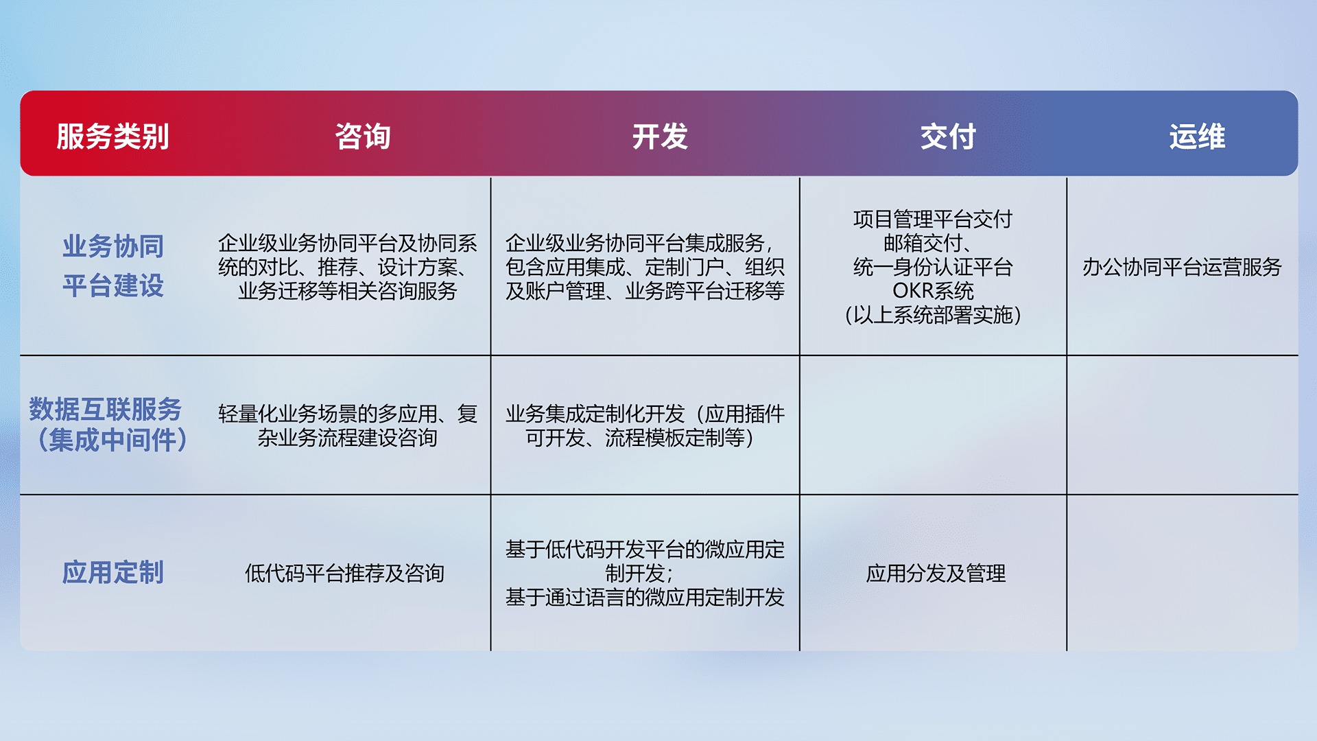 针对钉钉、、、企微、、、、IDaas等平台级产品提供产品的规划、、、、方案、、、、交付、、、定制化开发等服务,,实现如统一协同办公、、智能客户服务、、、、混合会议管理、、智能数据查询、、、等业务场景,,,,实现数字化转型。。。